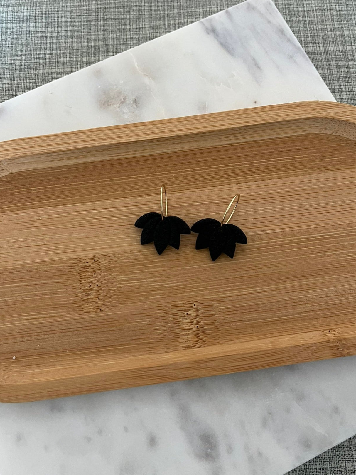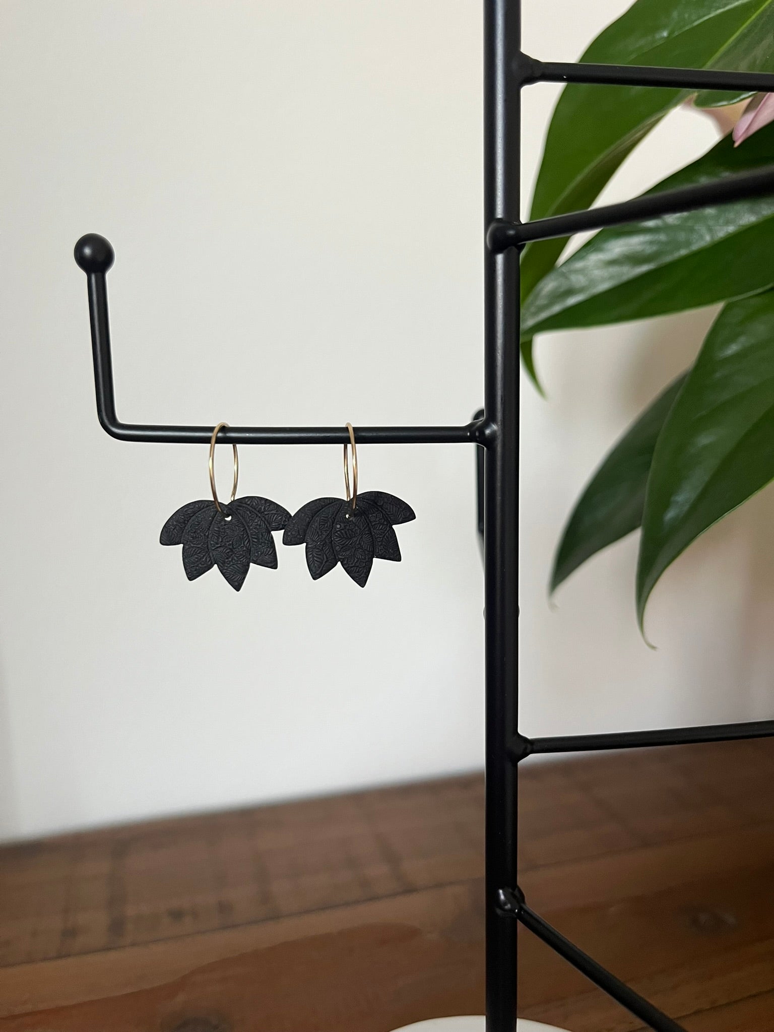 Klein maar krachtig: deze oorbelletjes combineren een elegant zwart lelieblad met een verfijnd goudkleurig ringetje.