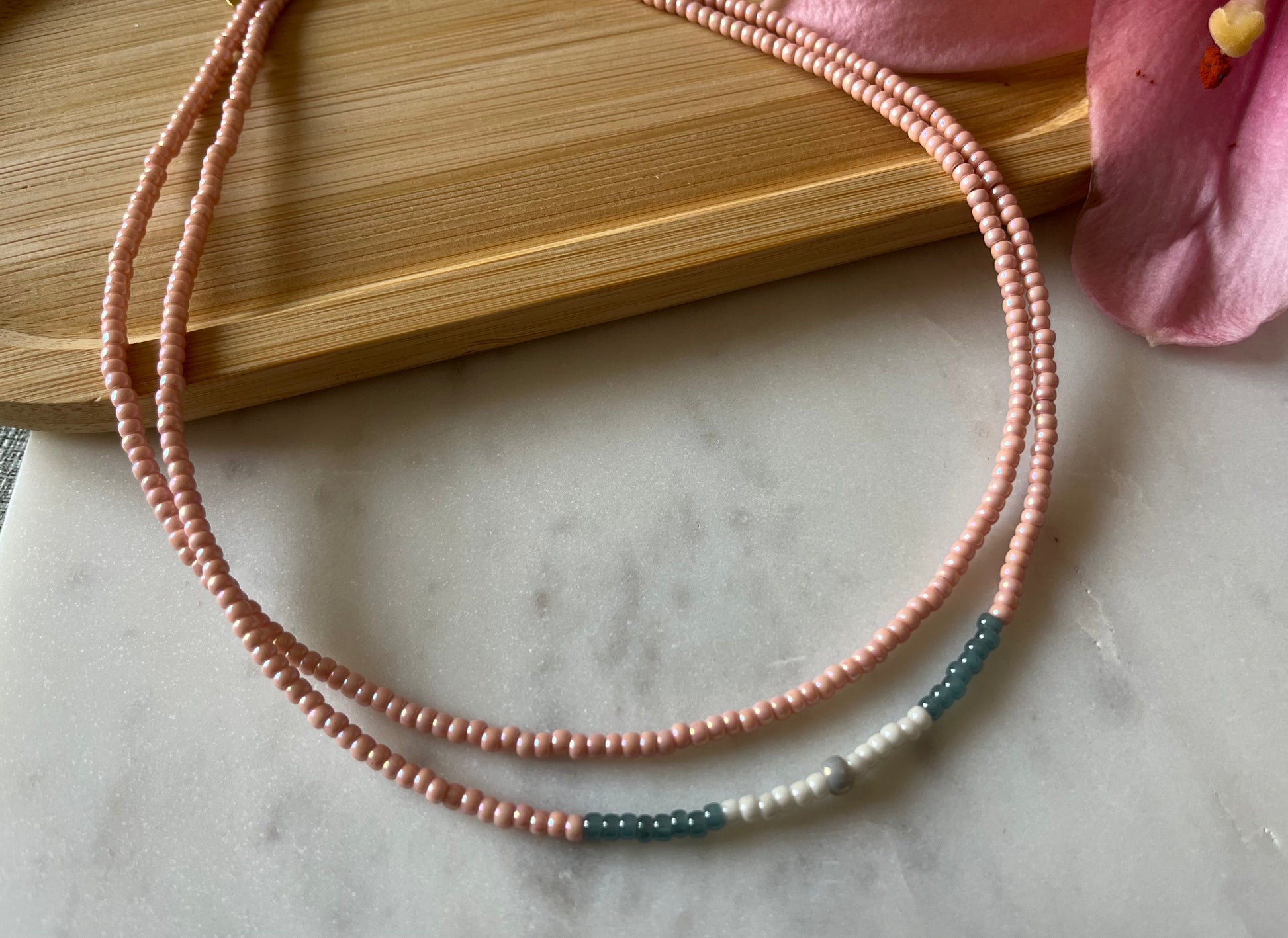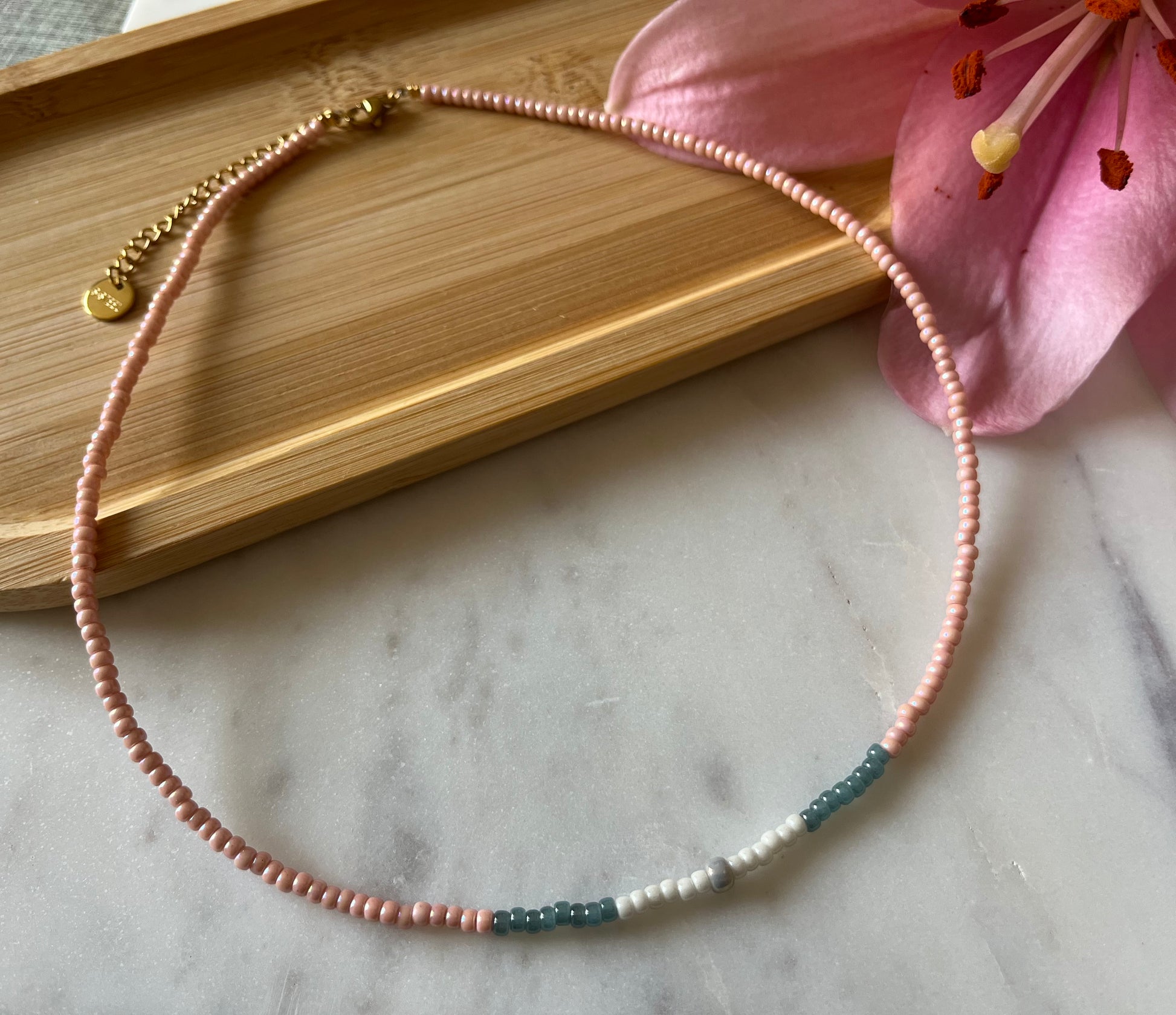 Dit zachtroze kettinkje is geïnspireerd op de schattige, pluizige koala’s die we in overvloed tegenkwamen op Raymond Island in Australië.