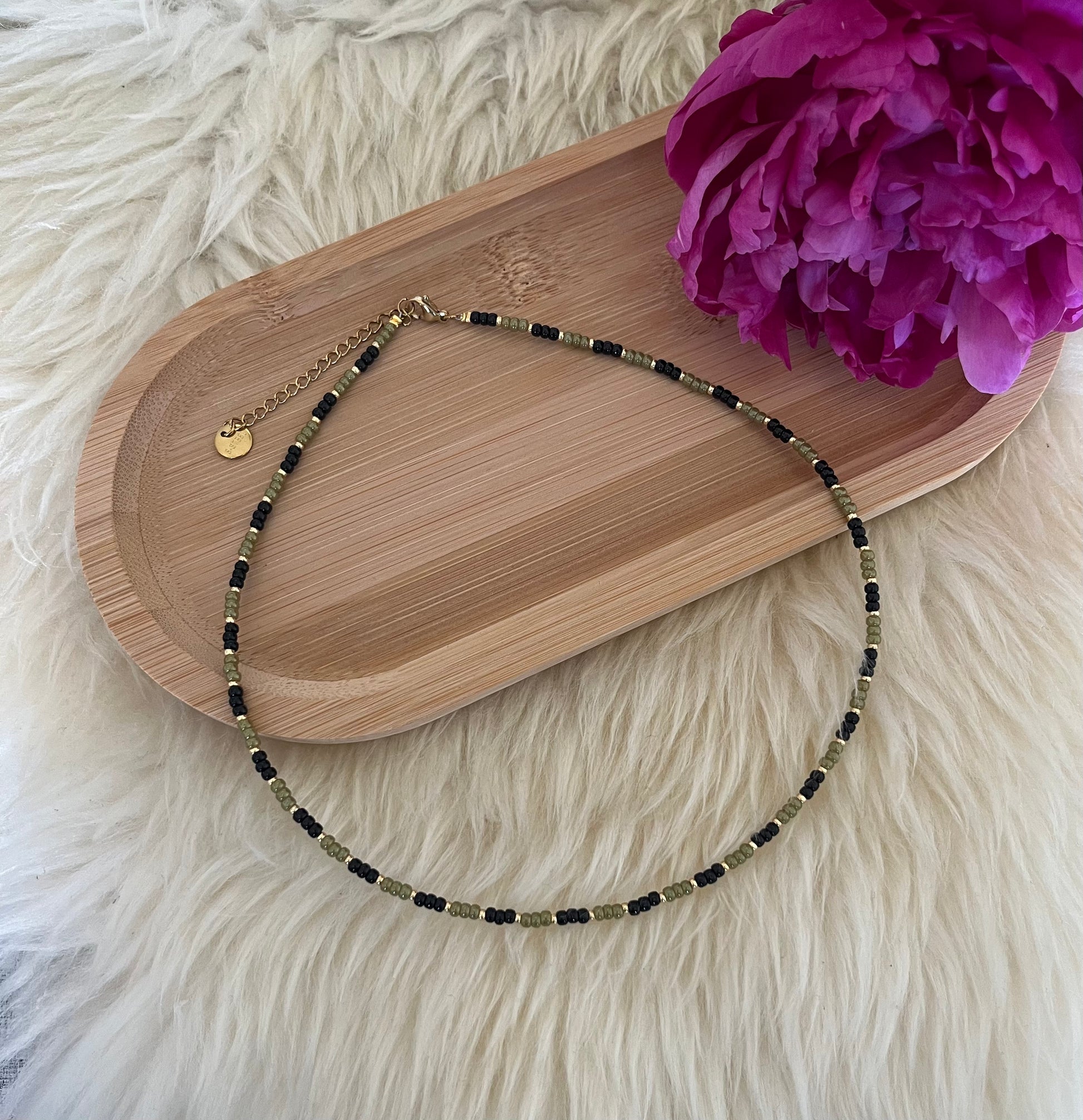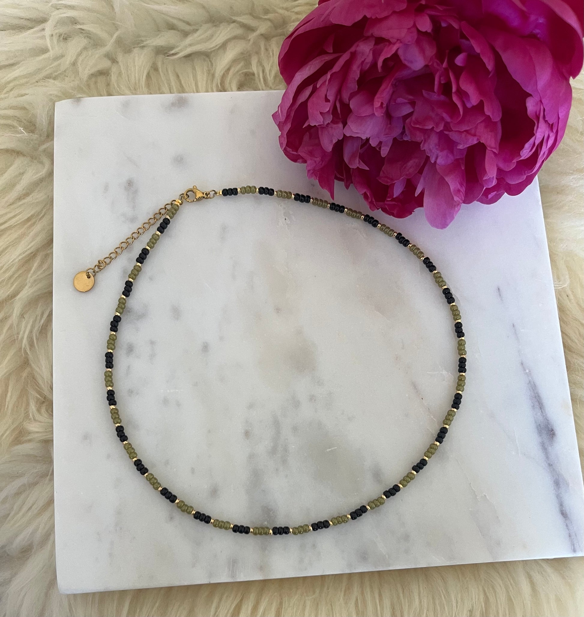 Een zachte combinatie van olijfgroen, diep zwart en warm goud – als zonlicht dat zacht door de bladeren valt. Subtiel, aards en sprankelend tegelijk.
